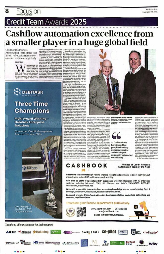 In November 2025, Cashbook proudly appeared in the Business Post following our win at the Credit Team of the Year Awards in Dublin, where we were named Credit Process Automation Team of the Year. The article highlighted the global impact of our work, recognising Cashbook’s support for credit teams around the world.