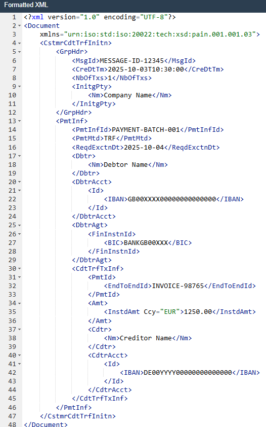 Corporate Treasury Operations: Large corporations use pain.001 messages to execute high-volume payment runs, including payroll processing, supplier payments, and intercompany transfers. The ability to bundle multiple transactions in a single message streamlines operations and reduces transmission costs.